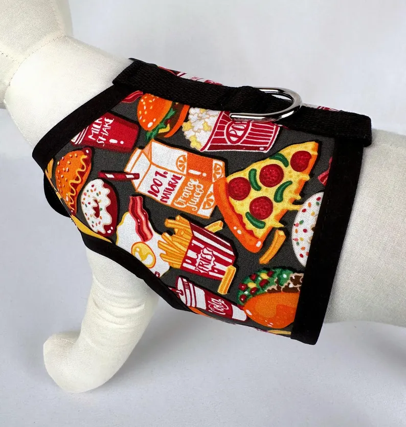 Your little dog will look so cute in this harness vest. The vest has a food themed print. It is lined in cotton.