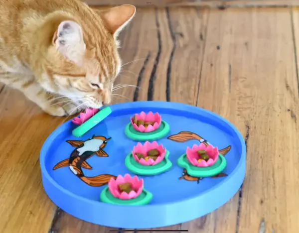 Spark your cats curiosity with this stunning koi pond puzzle feeder. Fill the lotus flowers with wet or dry treats, then add enough water for them to start floating around the pond. The flowers movement motivates natural hunting behaviors, providing mental stimulation promoting good mental wellbeing.